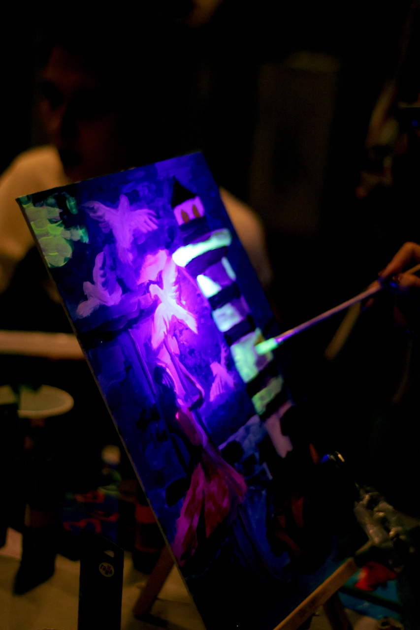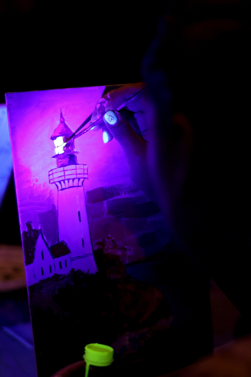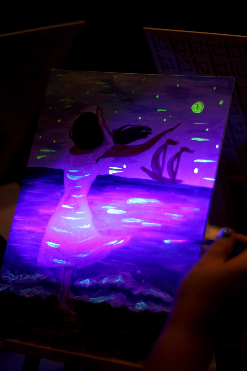 Создавая свои картины в неоновом сиянии, вы сможете почувствовать, как свет и цвет побеждают тьму, а ваша работа становится личным символом веры в чудо — таким же, каким были алые паруса для Ассоль. Работая в темноте с подсвеченными красками, вы почувствуете, как рождается магия света.